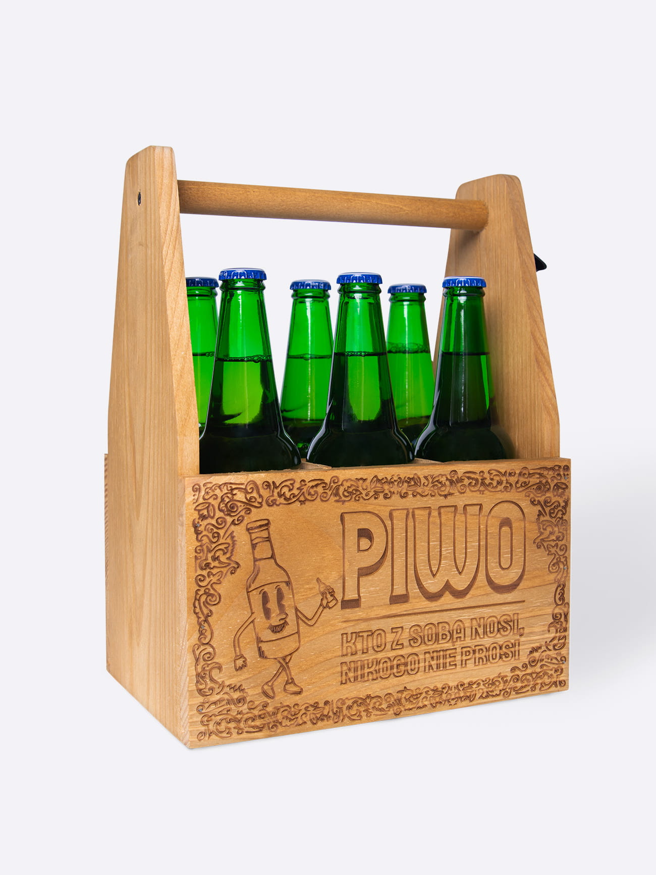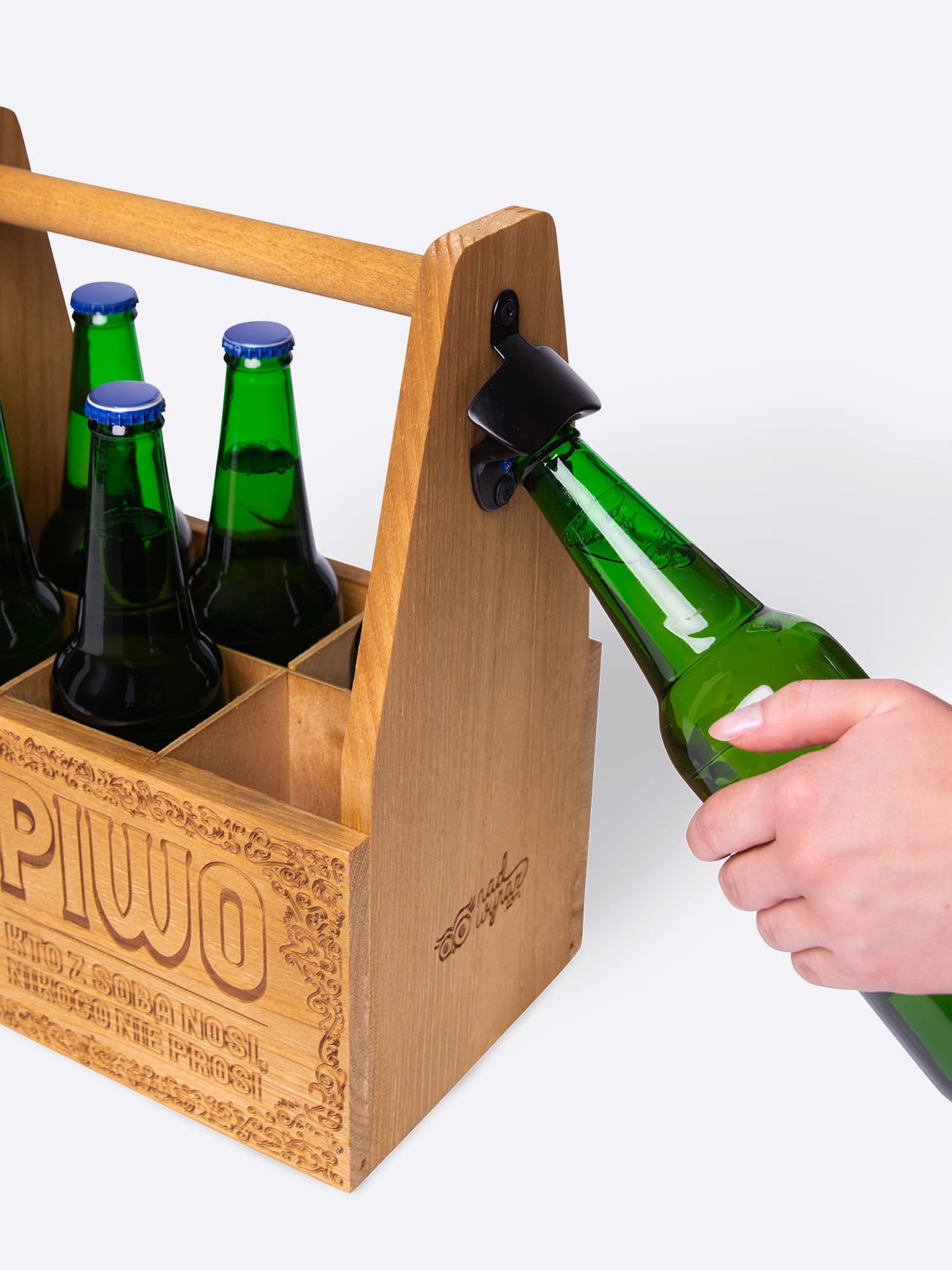Drewniane nosidło na piwo KTO Z SOBĄ NOSI, NIKOGO NIE PROSI to praktyczna propozycja na prezent dla mężczyzny. Mieści sześć butelek i idealnie sprawdzi się na działce, grillu, urodzinach czy wieczorze kawalerskim. Jest świetnym prezentem dla mężczyzny, który lubi konkret i dobry smak.